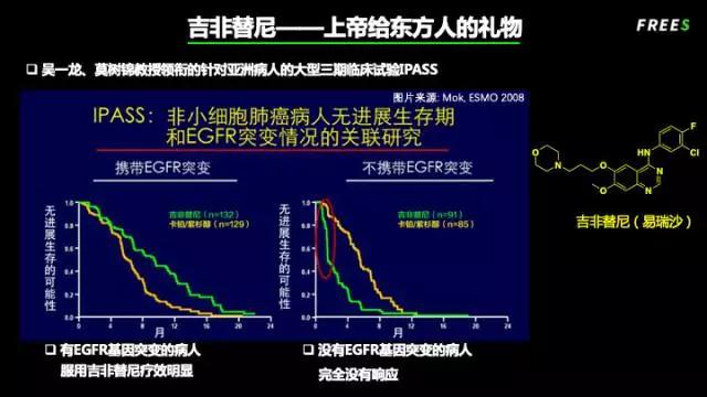 不过,中国学者感到不甘心,广州的吴一龙医生和香港的莫树锦医生在回顾性分析中发现,吉非替尼在肺癌病人中治疗效果确实一般,但在亚洲女性无吸烟史患者中的响应率比较高,这部分病人往往携带 EGFR 基因突变。于是,他们在中国和全亚洲做了一个有划时代意义的临床试验 “IPASS”,对病人进行基因筛选,找出那些携带 EGFR 基因突变的患者,看药物的疗效。