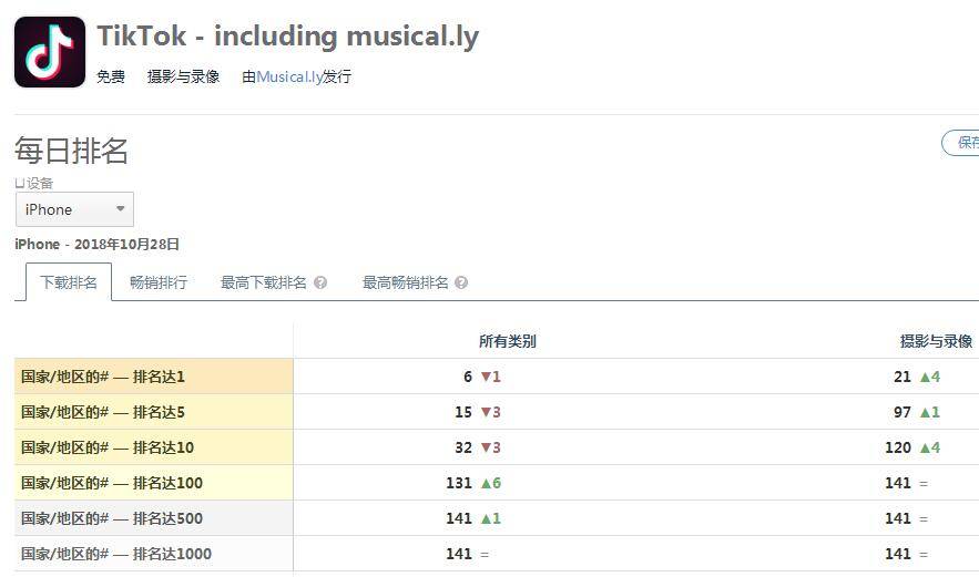根据App Annie的统计数据,10月28日当天,在141个产品上架的国家(不含中国)中,TikTok在32个国家进入App Store总榜下载前十名,在120个国家进入“摄影与摄像”产品类下载前十名。
