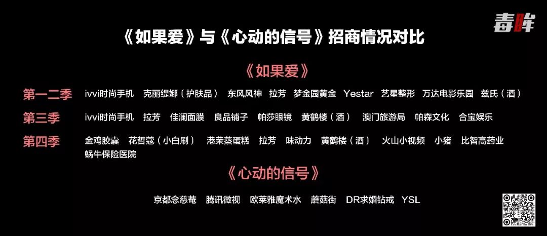 这种较强的女性群体消费属性,让类似品牌在节目中的广告植入性价比更高、暗藏商机。而这一特点从近年来此类综艺的招商品类上可窥视一二:《如果爱》的广告赞助中还有黄鹤楼等名酒品牌,到了《心动的信号》几乎都变成针对女性用户的品牌。