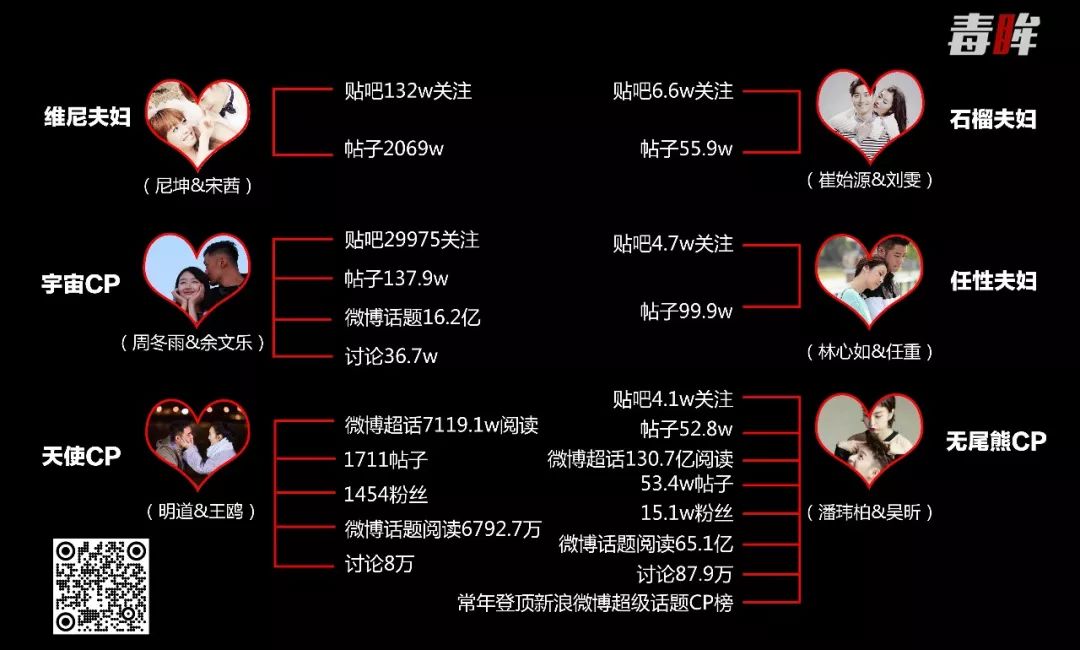 同时,在这些节目中大热的“石榴夫妇”(崔始源&刘雯)、“宇宙cp”(周冬雨&余文乐)、“无尾熊cp”(潘玮柏&吴昕)并未成真,参加节目的真情侣郑凯&程晓玥还在之后分手,但几对CP都赚足了话题。其中,节目结束一年后,“无尾熊”CP依然位居CP榜第15名。