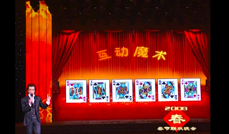 也是在2008年的春晚,李咏获得了一个单人节目,他在零点之后表演了一个互动魔术,六张扑克牌,就像朱、董、李、周、张、刘六位主持人一样一字排开。