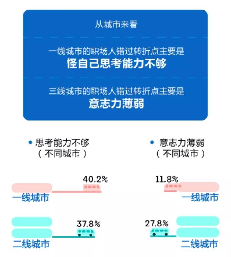 领英最新的一份调查报告显示,“选错了城市”和“选错了行业”是职场人最后悔的事情。在面对职场关键转折点时,只有37.4%的人会独立思考,而能够勇敢尝试的人只有33.8%.