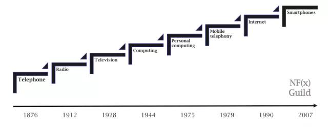 在同一个大周期内,又会陆续有一些小的周期性机会。这个过程中不断循环往复着4个阶段:繁荣,衰退,萧条,回升。比如19世纪末电话的诞生,20世纪中叶电脑的出现,90年代初互联网的发明(如下图),这些都是周期性机会。