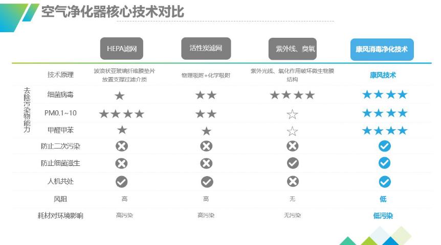 从功能看,「康风」能兼顾除雾霾、除甲醛甲苯、除细菌病毒等多方面。该产品凭借专利的新型材料,不仅可以100%分解甲醛,还可以快速去除细菌、真菌、病毒等致病微生物。因此该产品主要针对老人、小孩、鼻咽炎患者等易感染人群,能降低呼吸道传染病的发生几率和减少交叉感染机会。