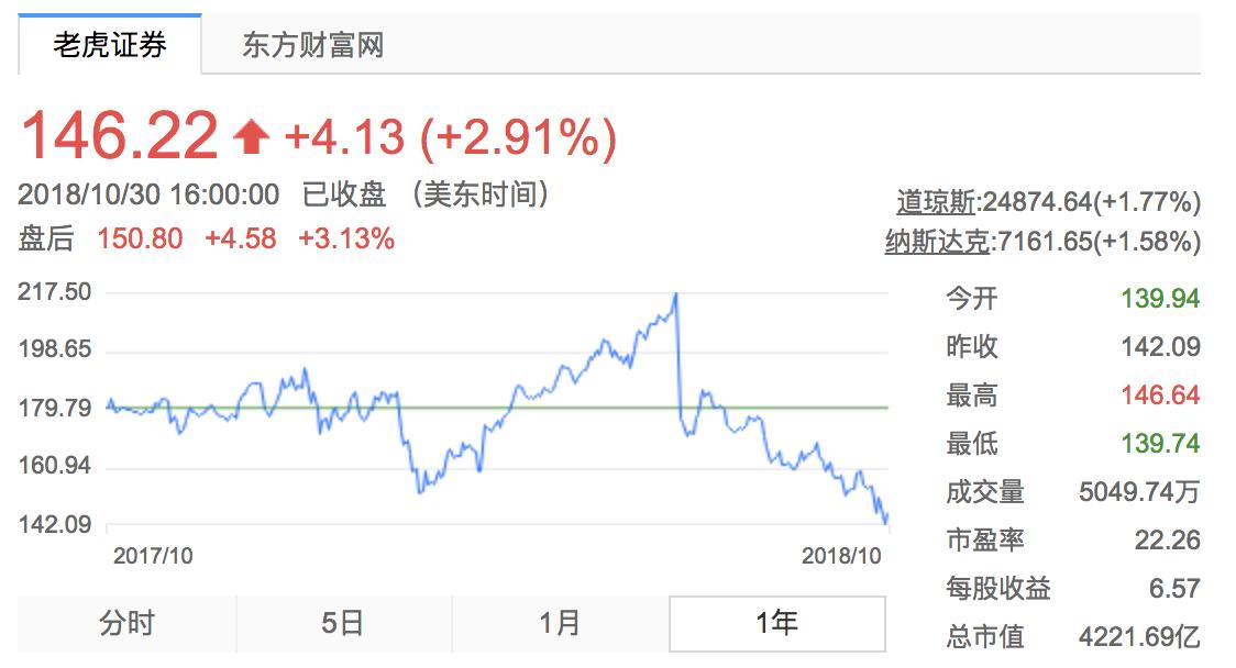 财报发布后,Facebook股价一度跌超6%,随后出现5%的回升。截至发稿,股价涨幅3.00%,每股报收150.61美元,市值在4222亿美元左右。这一市值要高于腾讯的24014亿港币(约为3061.29亿美元),后者将在11月14日港股盘后发布财报。