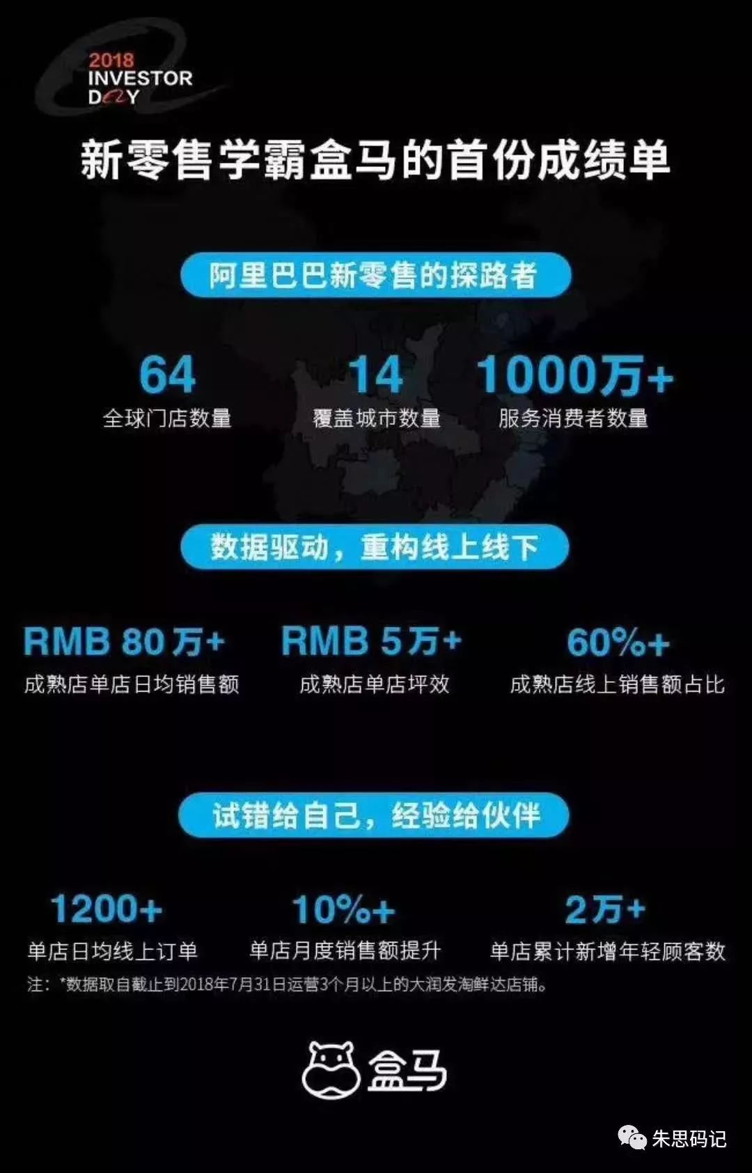 2018年9月17日,盒马鲜生CEO侯毅于阿里投资者日上首次披露了盒马鲜生过去32个月来从未公开过的一组数据:经营时间1.5年以上的成熟店坪效5万元,单店日销超过80万元,线上客单价75元,线下客单价113元。而据接近盒马高层的一位人士向朱思码记透露了一条未公开的捷报,称于2016年1月15和9月30日,分别在上海市中环内开设的两家门店:金桥国际商业中心店和大宁音乐广场店已于今年中后旬成功完成了前期投入成本的回收,正式进入漫长的利润收割期。