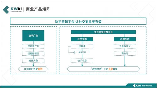 因此,快手也将立足于社交生态的快接单、快享计划、快手小店和立足于内容生态的矩阵号、商业号称为“老铁经济下的长效营销”。