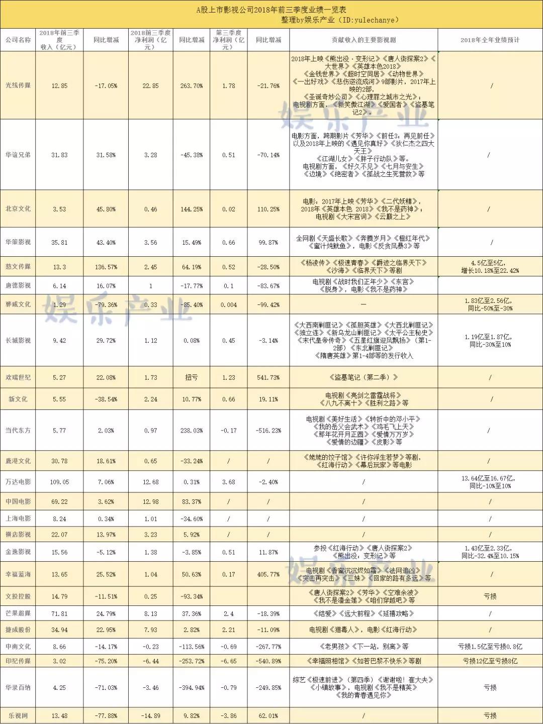 截至10月31日,A股上市影视公司2018年三季报披露工作正式收官。总体来看,无论是电影公司、电视剧公司或者院线公司,业绩大都呈现下滑态势。