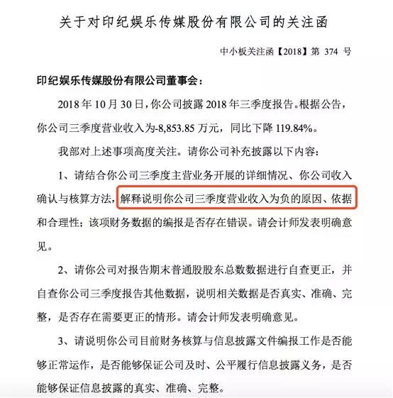 更奇葩的是,印纪传媒第三季度的营收竟然是负数,-8853.95万,因此三季报披露第二天,公司再次收到监管部门的关注函,要求公司说明营收为负数的原因、依据和合理性,以及是否存在错误等。