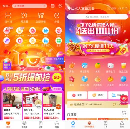 111111份霸王餐,1分钱爆品,1元大牌秒杀,5折套餐……双11期间,全国用户用饿了么点外卖、买东西,用口碑APP点餐、买吃喝玩乐套餐都能享受五折或者特价优惠。目前,口碑APP和饿了么的双11主会场都已经上线。