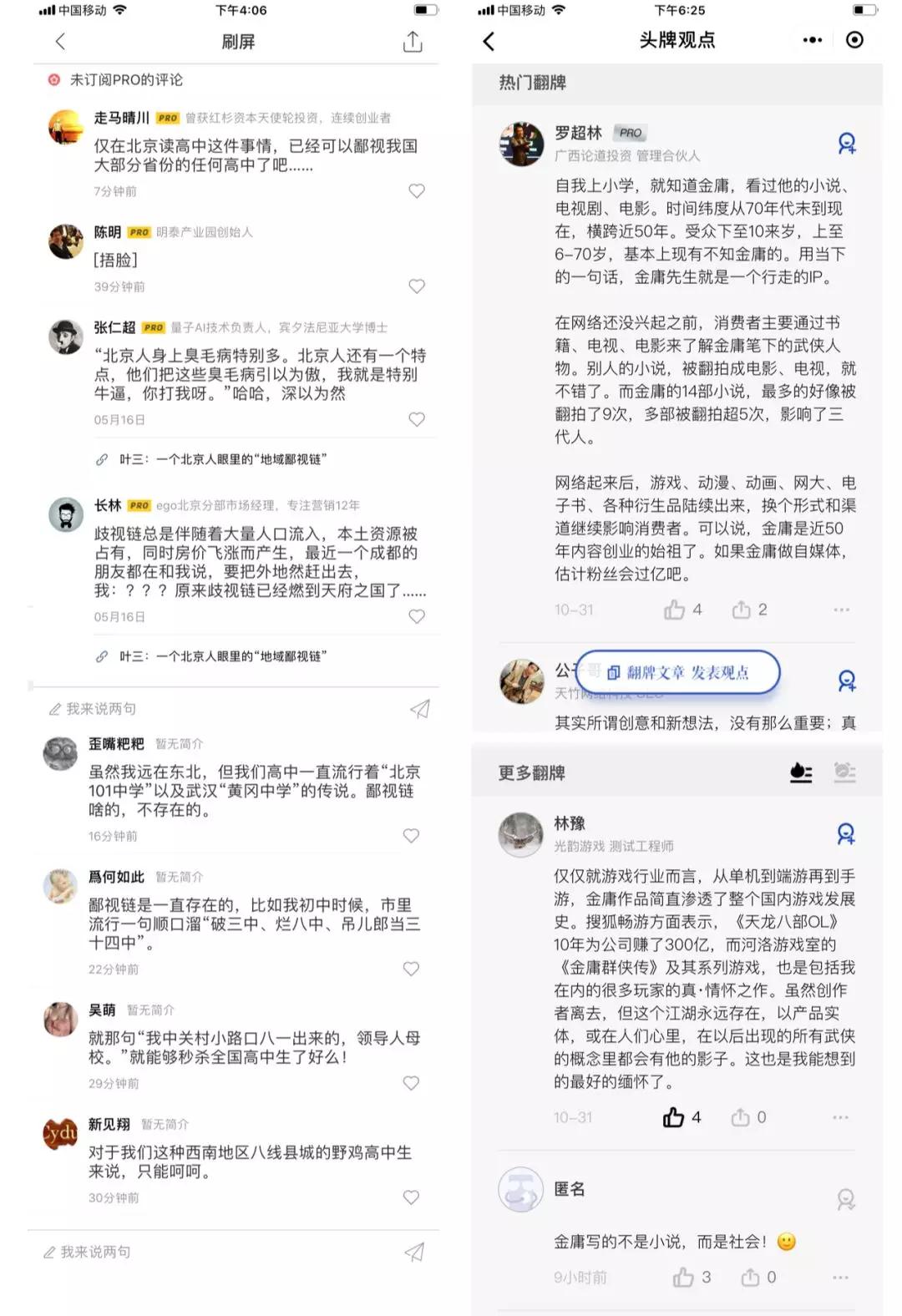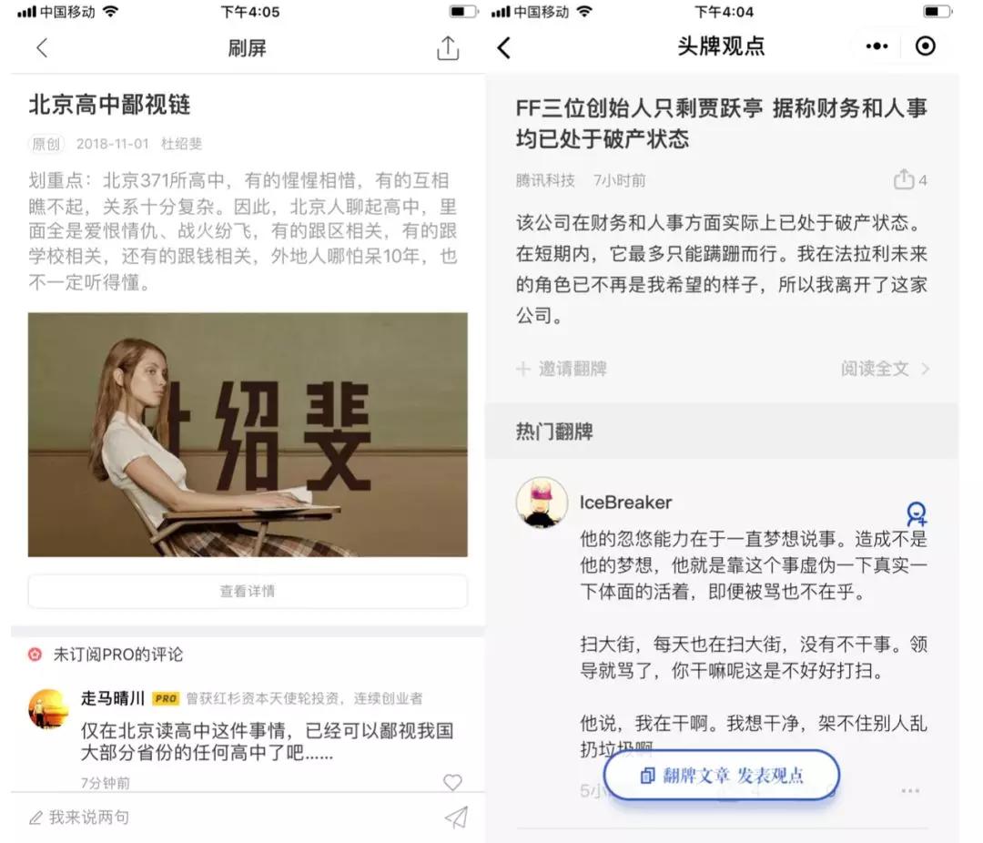 双方的设计逻辑都是认为评论即内容,因此评论优先于文章。同时,与刷屏相似,评论区都采取了二分法:将热门或者意见领袖的评论与普通评论分割。
