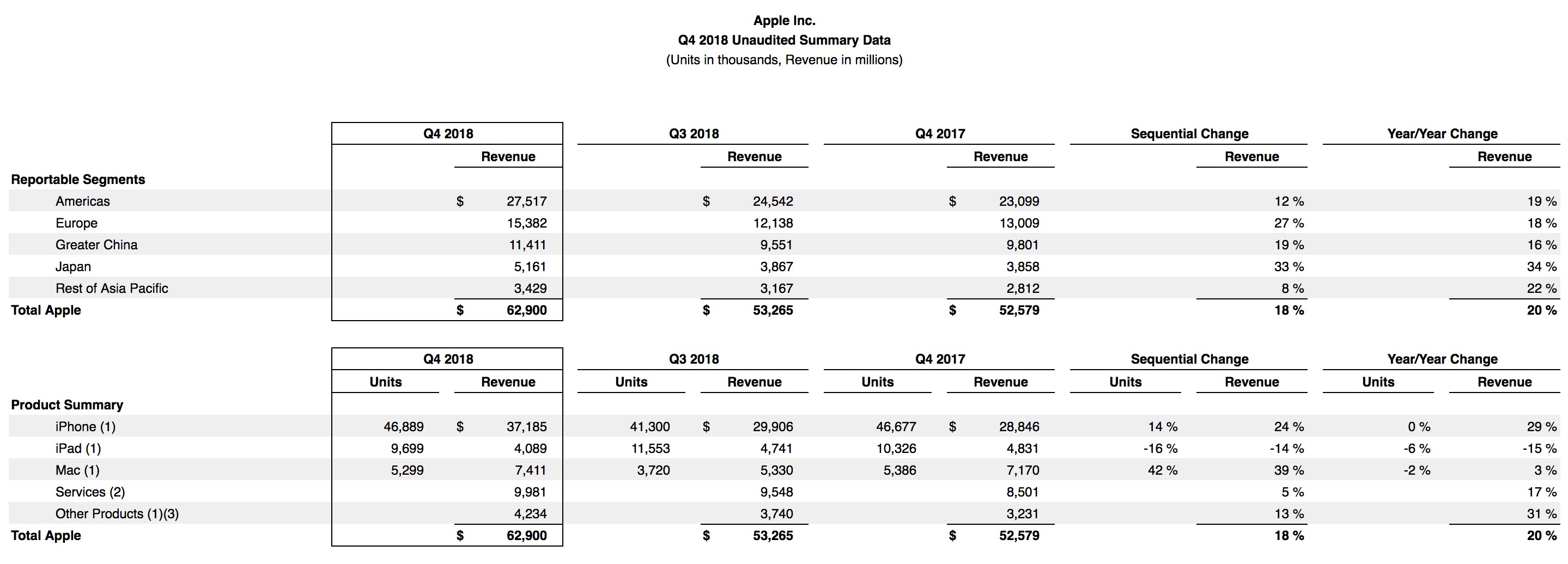 苹果当季营收为629亿美元,同比增长20%,是2018财年同比增速最好的一个季度。净利润141.25亿美元,同比增长31.8%,摊薄每股收益(EPS)为2.91美元,同比增长41%。至此,苹果以史上最佳Q4,为史上最佳财年完美收官。