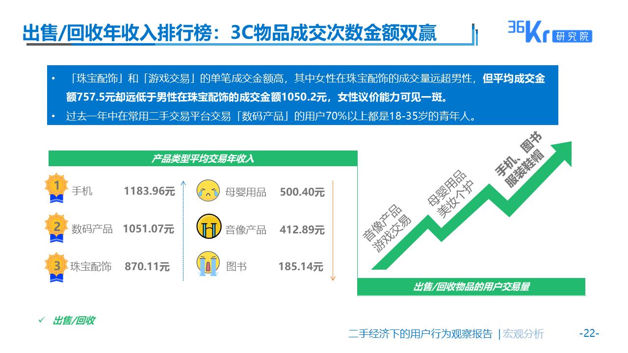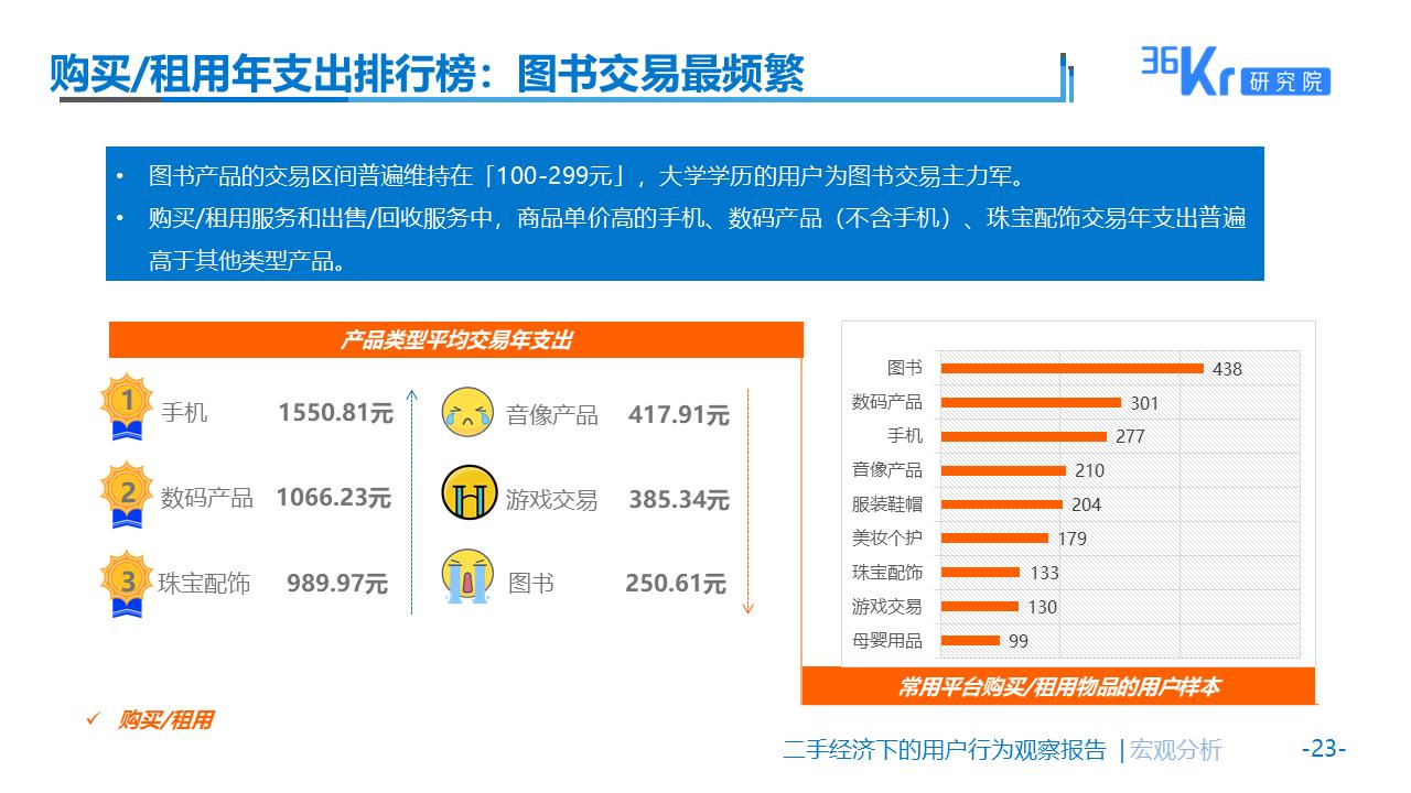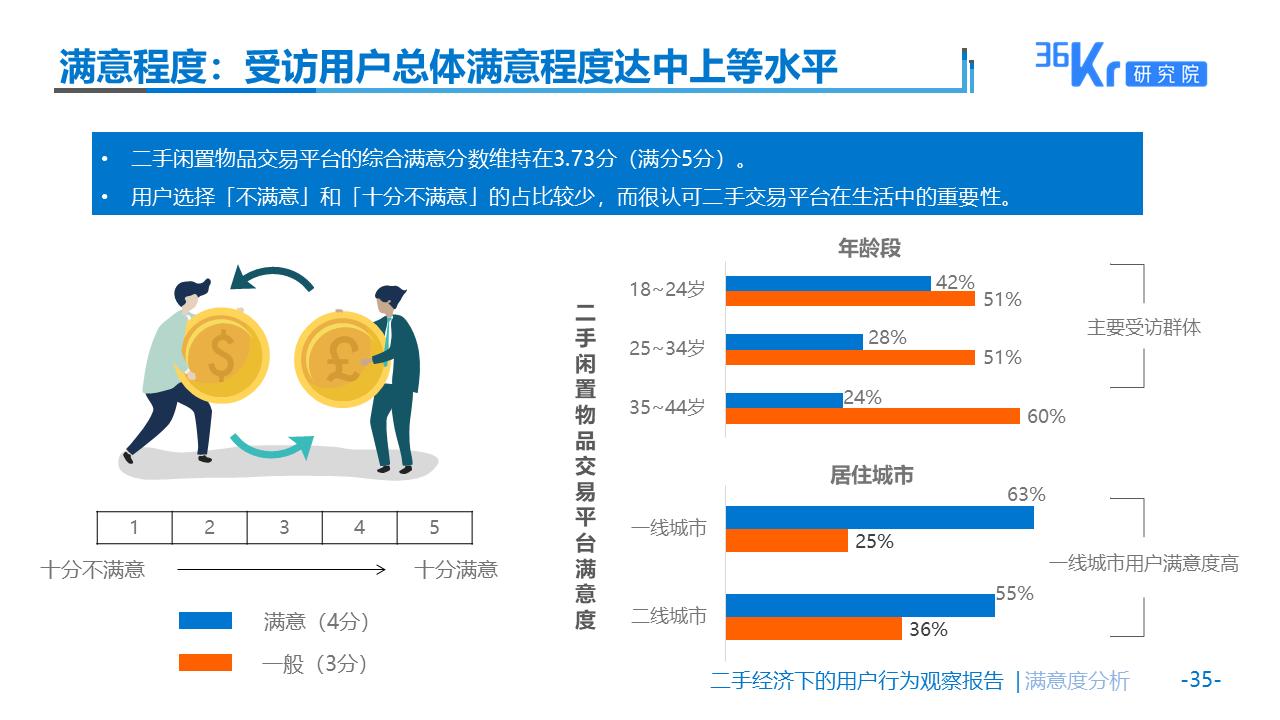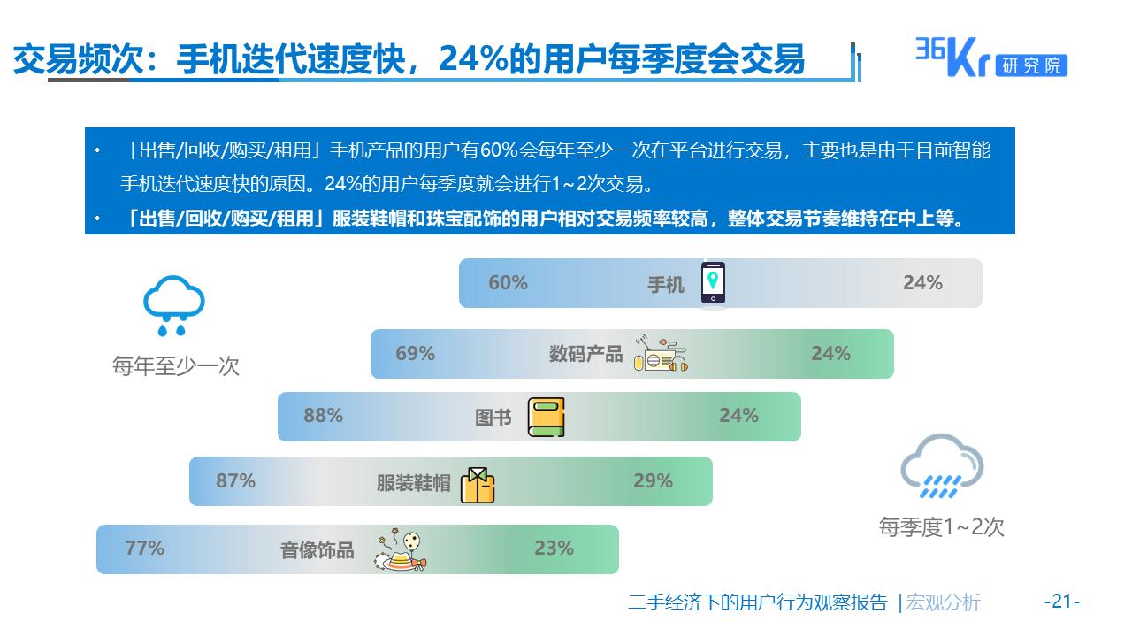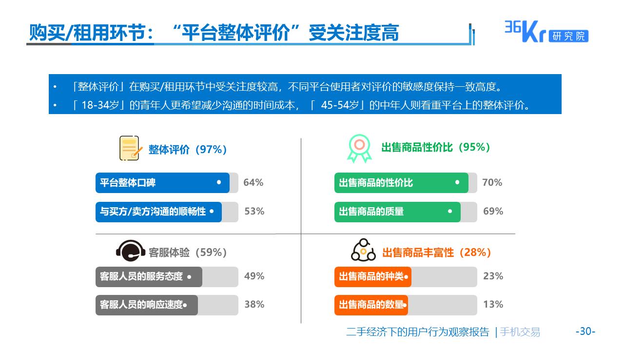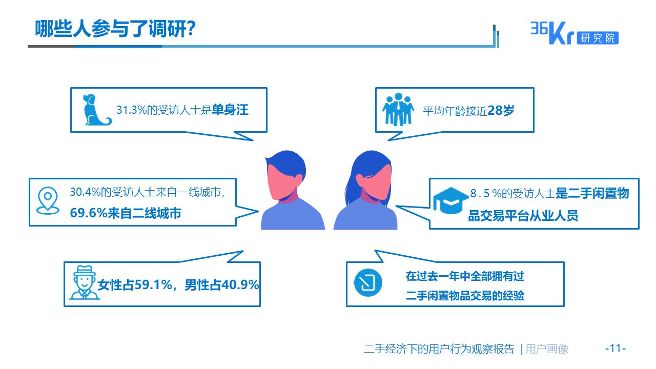 从二手交易的品类来看,由手机/电脑等3C数码、图书音像产品、珠宝服饰,到个性化的母婴产品,甚至游戏交易等交易圈子小众的品类都有所涉及。为了探究二手交易行业下的用户使用现状,36氪研究院对使用二手闲置物品交易平台用户的交易行为、使用频率和满意度等维度进行了调研,发现了一些核心结论。