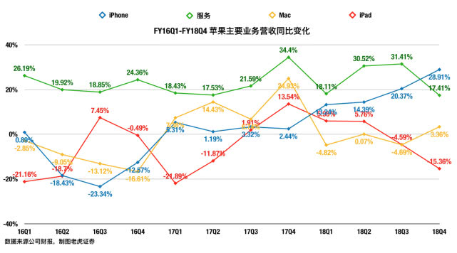 第三,由于各产品销量增长早已放缓,苹果近年来一直在向服务业务转型,期望借助庞大的苹果激活设备的基数,实现Apple care、TAC、Apple Music、Cloud Services等业务的持续高增长。而被寄予“战略转型”这一重任的服务业务,本季度不达预期,增速放缓。