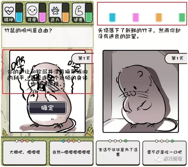 在葡萄君实际体验过后,《竹鼠:活下去》并没有给我留下较好的印象。首先这是一款文字类游戏,制作十分轻量,功能也相对简陋,但完成度却经不起推敲。UI 本身不具备很好的欣赏性,但问题还在于首发版本频频出现界面 Bug ,游戏画面中的元素不是丢失就是层叠。再加上黑屏、闪退等劝退情况时有发生,这番初体验不得不说是比较糟糕的。