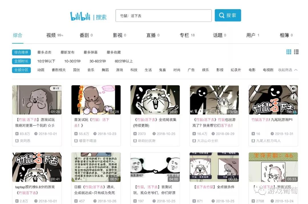 从登陆 TapTap 再到开放下载,《竹鼠:活下去》进入玩家视野不过 30 天,目前的预约数已超过了 25 万次。另外,B 站作为梗的制造与传播的重要平台,关于该游戏的相关搜索结果已多达 35 页。