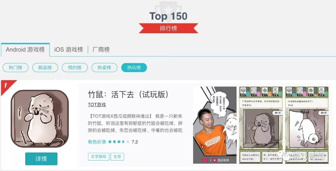 当然,游戏从业者自然不会忽视梗的影响力。在现如今,以亚文化为灵感来制作游戏也成为了玩梗的实践方式之一。而且葡萄君注意到,在 10 月 25 上线的《竹鼠:活下去》便是一款玩梗产物。该游戏首日开放下载不过多时,便称霸 TapTap 热玩榜。