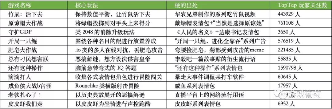 葡萄君整理了一部分近些年上线的玩梗手游,并且发现轻量开发、搞笑、品类休闲、具有爆发性人气是这些玩梗游戏的共同特征。