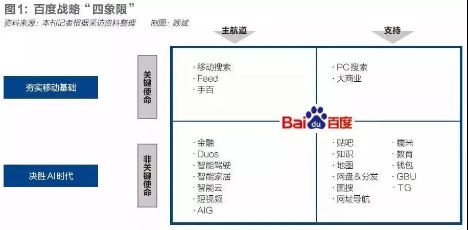 如上为财经杂志整理的百度战略四象限,但究本质,百度其实只是按照“重要”和“紧急”程度对各个业务做了分类。在百度过去多次的组织架构调整中,始终未曾见到让人觉得特别明晰的战略主线,各个业务之间也并未形成合力。