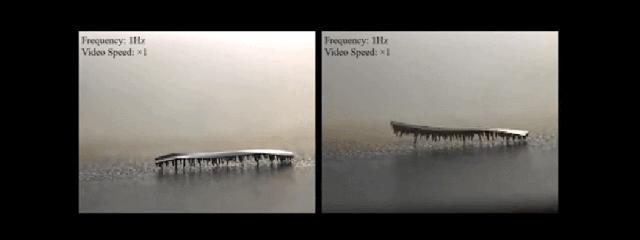 研究报告作者指出:“材料和多腿设计大大提高了机器人的疏水性。另外由于硅胶块是软的,它可以很容易地被切割成各种形状和大小,制成不同的机器人用于不同的用途。”