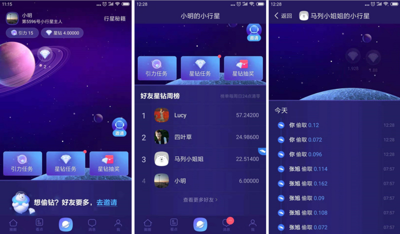 中间的就是星球版“蚂蚁森林”,用户完成系统规定的不同行为能获取星钻,如上所及还可以去偷别人的星钻。当然,蚂蚁森林是支付宝内部的一个公益小游戏,用户获取的绿色能量主要是可以种树,“网易圈圈”的星钻则是可以赚钱;而且在用户的反馈之下,支付宝已经取消了“可以偷取别人绿色能量”的功能,但类似的排名和社交激励体系依然存在。