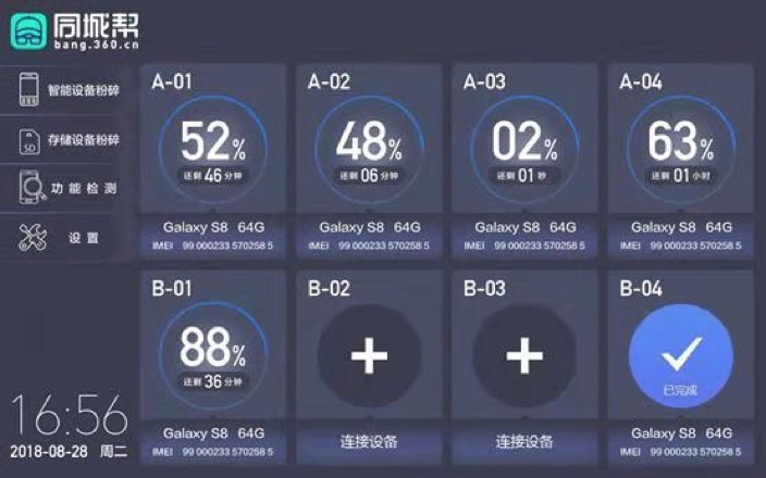 当然,数据清除是十分专业的,且清除过程抽象、不可视,对此,普通大众难免会有疑虑:到底清除了没有,清除了哪些数据?而360同城帮的第三代隐私粉碎技术全球首创性实现了“现场”粉碎,销毁过程可通过360同城帮的隐私粉碎设备或手机全程监控,让隐私粉碎走到前台,可接触,有温度。不仅如此,隐私粉碎完成后,360同城帮还会发送一份电子版的隐私销毁报告,让用户手中有据、心中有数,进一步消除其手机回收后的顾虑。