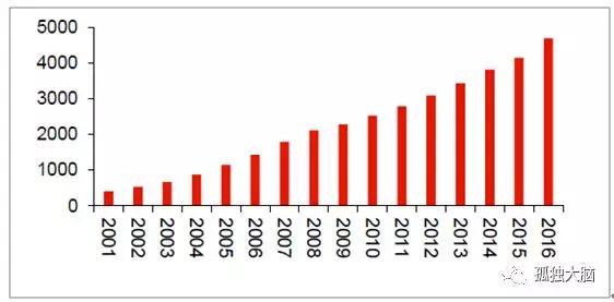 2001-2016 年,全国购物中心数量以17.6%复合增长率逐年攀升,2016 年已超4700 家。