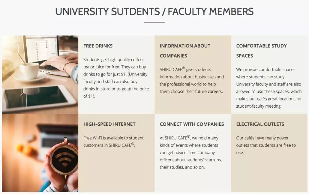 顾客在换取免费的咖啡前,要在 Shiru 的官网上登记包括姓名、出生日期、电话号码、邮箱地址、兴趣爱好、工作经历在内的个人信息。登记完成后,顾客即可在门店里免费换取咖啡。学生和教职员工将享有以下福利: