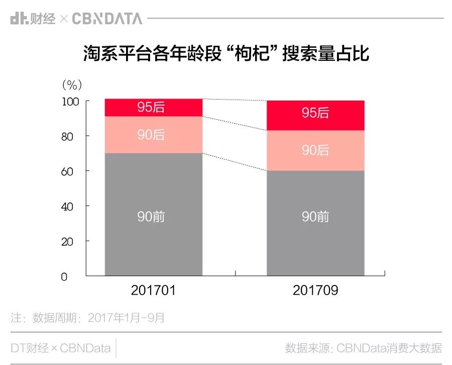 枸杞上榜,并不令人惊讶。CBNData《2018生活消费趋势报告》显示,95后在淘宝搜索“枸杞”的次数在不到一年间占比涨了不止一倍,堪称老少通吃了。
