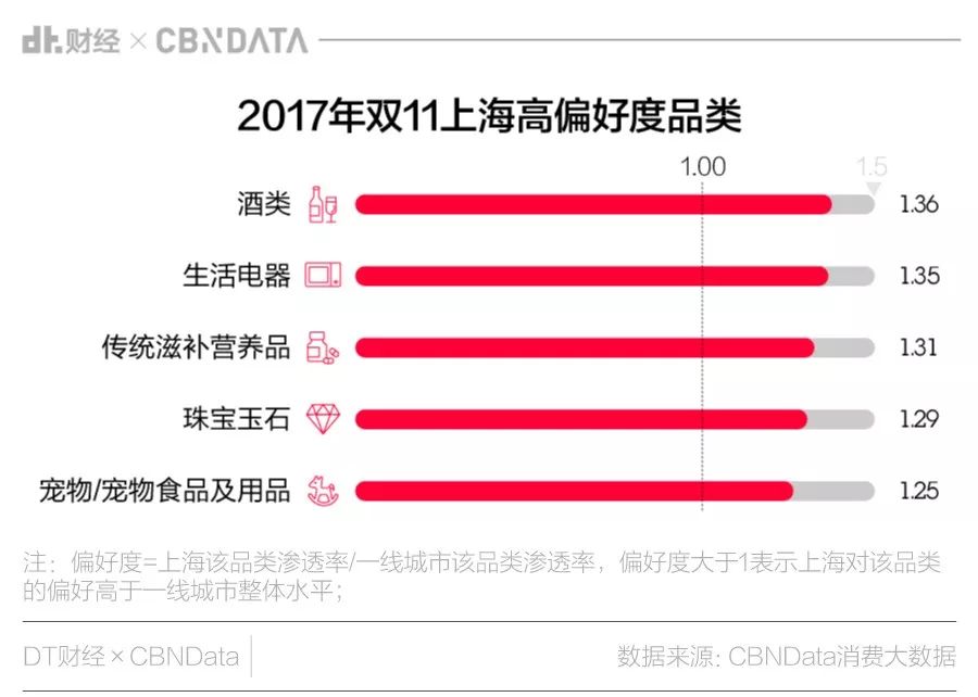 酒是中国人餐桌的必备品,上海人也喜欢来一口。在上海双11的消费偏好中,酒类竟然排在了第一。