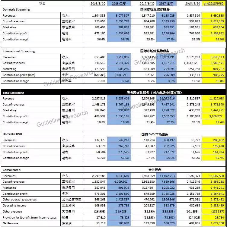 2018年前三季度,奈飞Q1、Q2、Q3的总收入分别为:37.01亿美元、39.07亿美元和40亿美元,超过116亿美元,约合800亿人民币,而爱奇艺三个季度的总收入分别为49亿元人民币(约7.776亿美元),62亿元人民币(约合9.325 亿美元)和69亿元人民币(约合10亿美元),总计只有180亿人民币,还不到达奈飞的1\4。