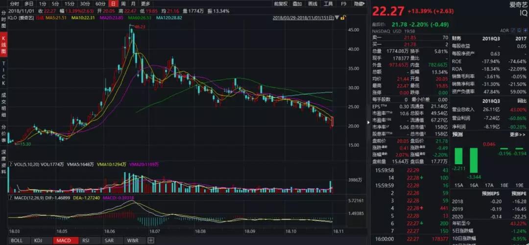 第三季度净亏损31亿元,使得爱奇艺盘后大跌13%。第二天开盘爱奇艺股价重挫11.53%,交易量较前一日扩大220%。之后一天,随着中概股的集体走高,爱奇艺又上涨了13.4%,上周五,爱奇艺收盘跌幅5.1%,股价回到21.1美元。