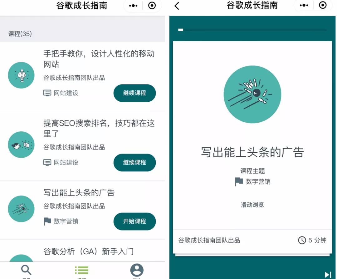仔细一看,谷歌这个教程包含多个种类的课程,横跨创业、运营、营销等多个领域,也贯穿了企业实际运营的多个环节,在系统性教授相关知识的同时,还把谷歌的产品巧妙地融入进去,比如数据分析部分就以“谷歌分析”为例说明网站应该如何更好地进行数据分析和统计,目前已上线的课程有35款,分九个不同类型,据了解这些课程还会持续更新,即它是一个不断更新的动态移动学习小站。