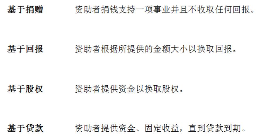众筹模式包括基于捐赠的众筹(捐赠人通常不会获得任何回报)、基于回报的众筹(支持者提供资金以换取某种回报 - 通常是众筹项目的产品)、股权众筹(支持者向公司提供资金以换取公司的一部分股权)和债务/贷款众筹(放贷人提供资金,并在某个时期连本带利收回)。