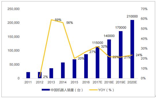 销量年复合增长超过20%如下图所示,中国机器人的销售数量从2013年开始快速增长,年复合增长率超过20%,2018年预测有超过14万台的出货量,按照平均售价20万计算,工业机器人仅本体市场规模就高达280亿。