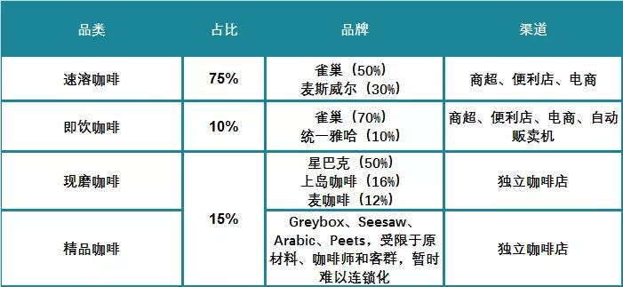 今年,瑞幸咖啡“互联网+”模式的出现,给中国整个咖啡市场带来一个很大的影响。在现有的咖啡品类中,占比最多的就是速溶咖啡,其中最有代表性的是雀巢和麦斯威尔。除了速溶咖啡之外,我们整体上把咖啡分成四个主要的产品线:速溶咖啡、即饮咖啡、现磨咖啡、精品咖啡,分类如下: