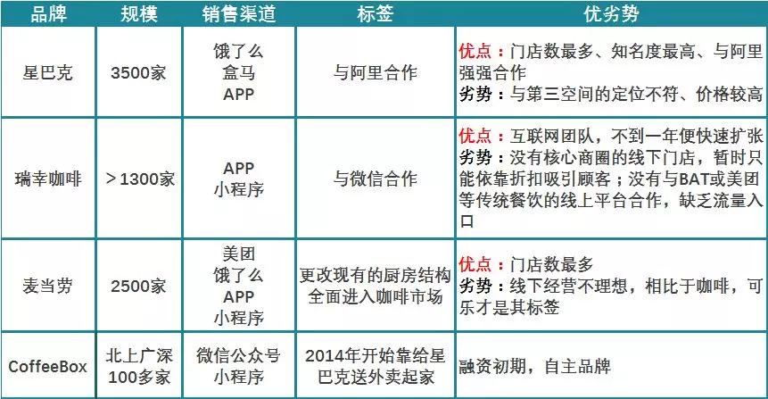 中国目前推出咖啡新零售的品牌有星巴克、瑞幸咖啡、麦当劳、CooffeeBox等,它们各自的规模和市场现状可通过下面的表格来了解: