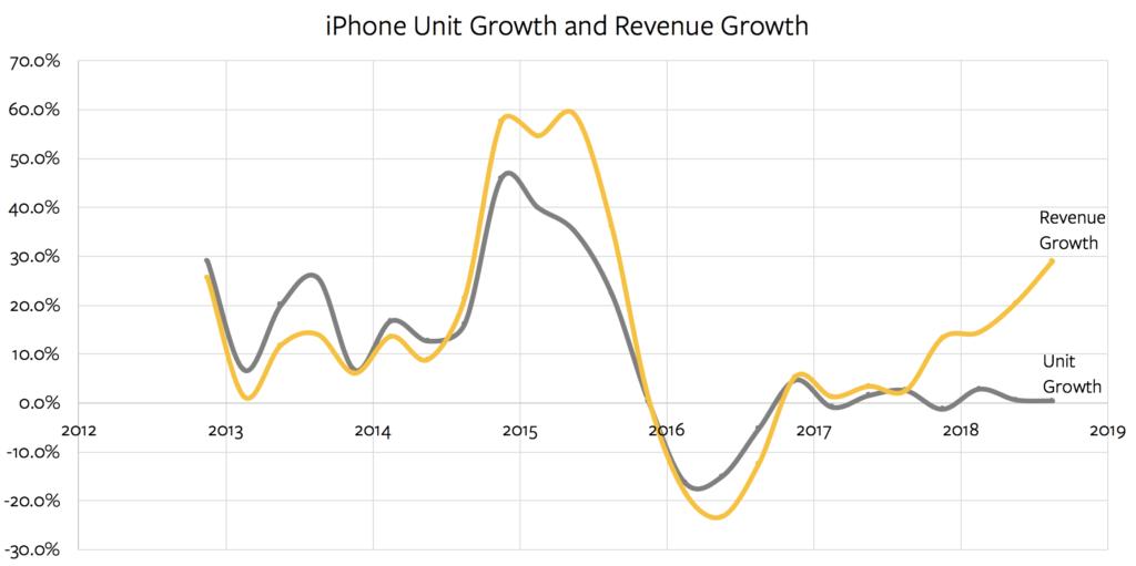在iPhone推出的早期,iPhone的销量增长和收入高度相关,当时产品线中唯一的价差与旗舰设备上的内存容量相关。然而,随着苹果开始将旧型号的iPhone保留在产品线中,导致平均售价缓慢下降,收入增长略慢于销量增长。