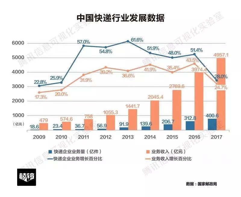 民营快递公司正是在这十年间异军突起。如今,它们不光撑住了“双十一”期间如洪水一般的包裹,配送效率在全世界也是首屈一指,而中国的快递行业的业务量已经连续四年位居全球第一,去年超过400亿件,收入达到4957亿元,行业内涌现出包括顺丰、三通一达等在内的六家上市公司。