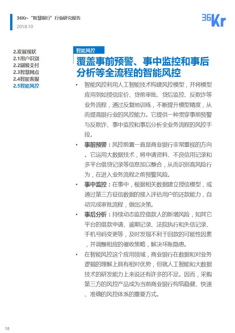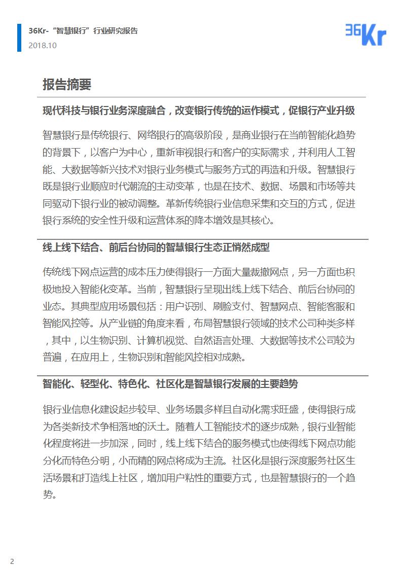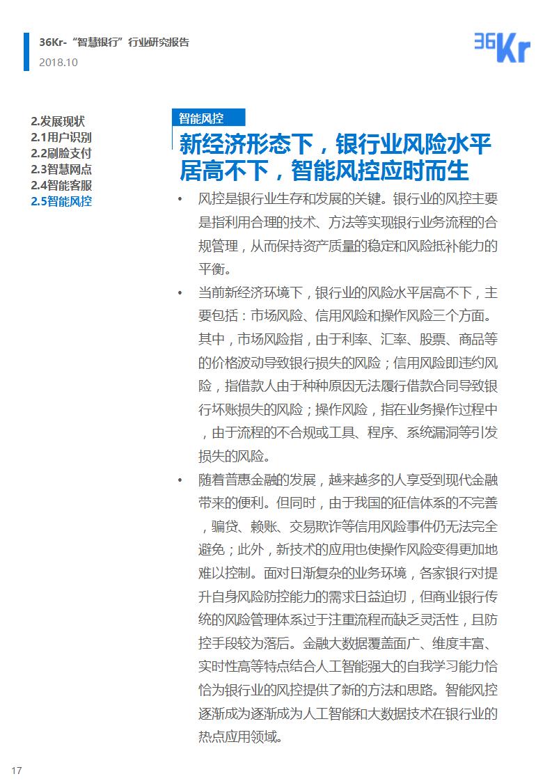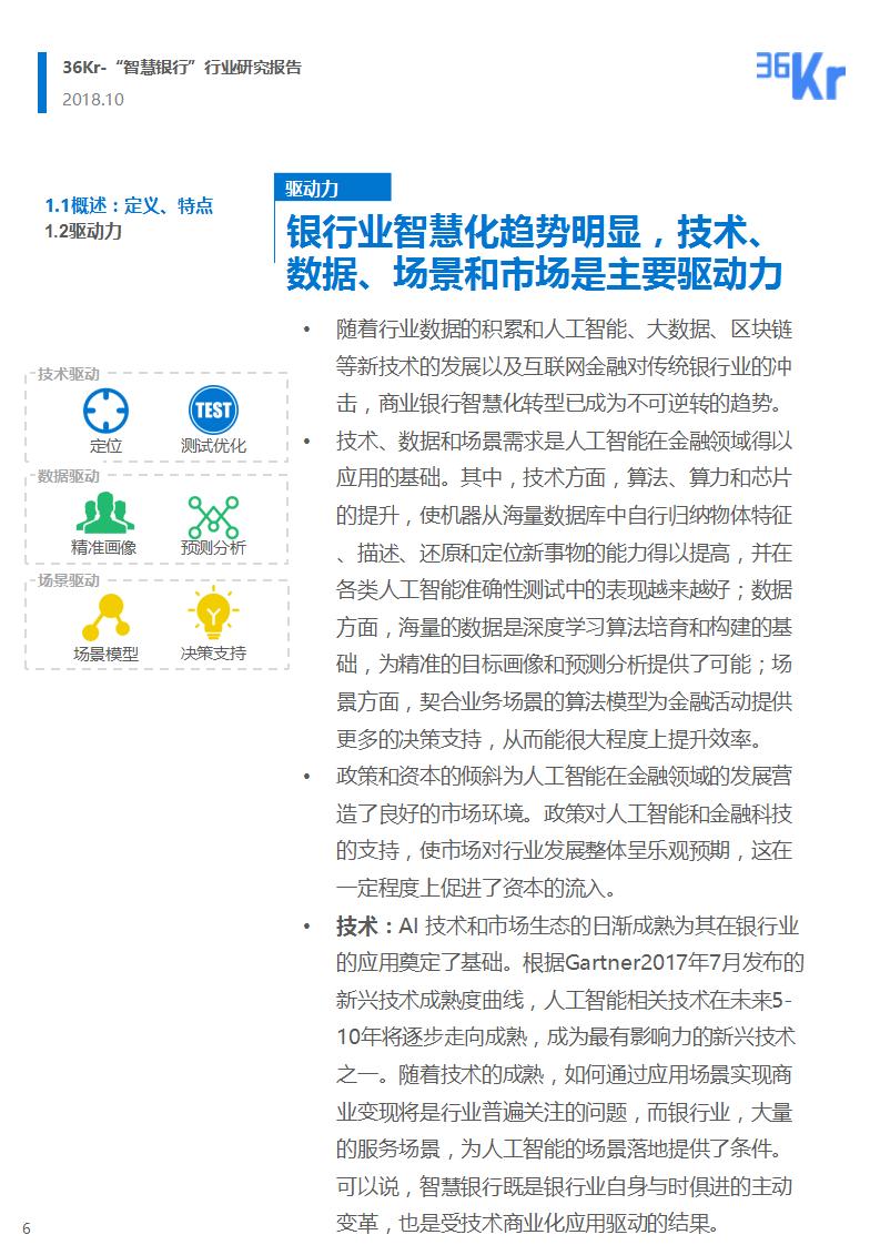 技术、数据、场景和市场是主要的驱动力。技术方面,随着人工智能等技术的逐渐成熟,其商业应用场景逐渐受到行业的重视,银行业因数据量大,应用场景众多而成为各项技术争相落地的沃土;数据方面,金融业大量的数据沉淀对数据处理工作提出了更高的要求,也为大数据、人工智能等技术的应用提供了数据基础;场景方面,银行业务场景多样且呈精细化运营的趋势,针对各个环节的服务创新有助于提升效率,优化服务;市场方面,互联网金融的发展给银行业务带来不小的冲击,使传统银行在面临同业竞争的同时,还不得不应对新经济形态带来的用户习惯的改变和用户对服务质量要求的提高。激烈的市场竞争环境促使银行以客户为中心,重新审视用户需求,利用新技术手段优化业务流程,从而提升银行业的运营效率和服务水平。