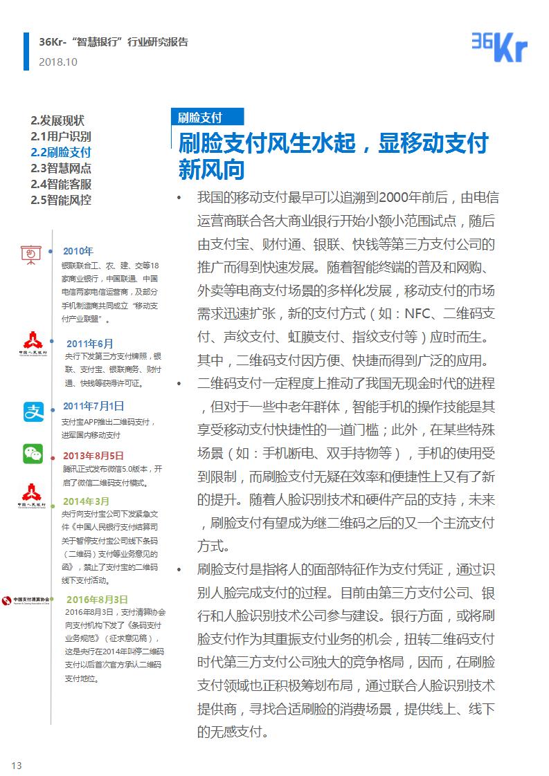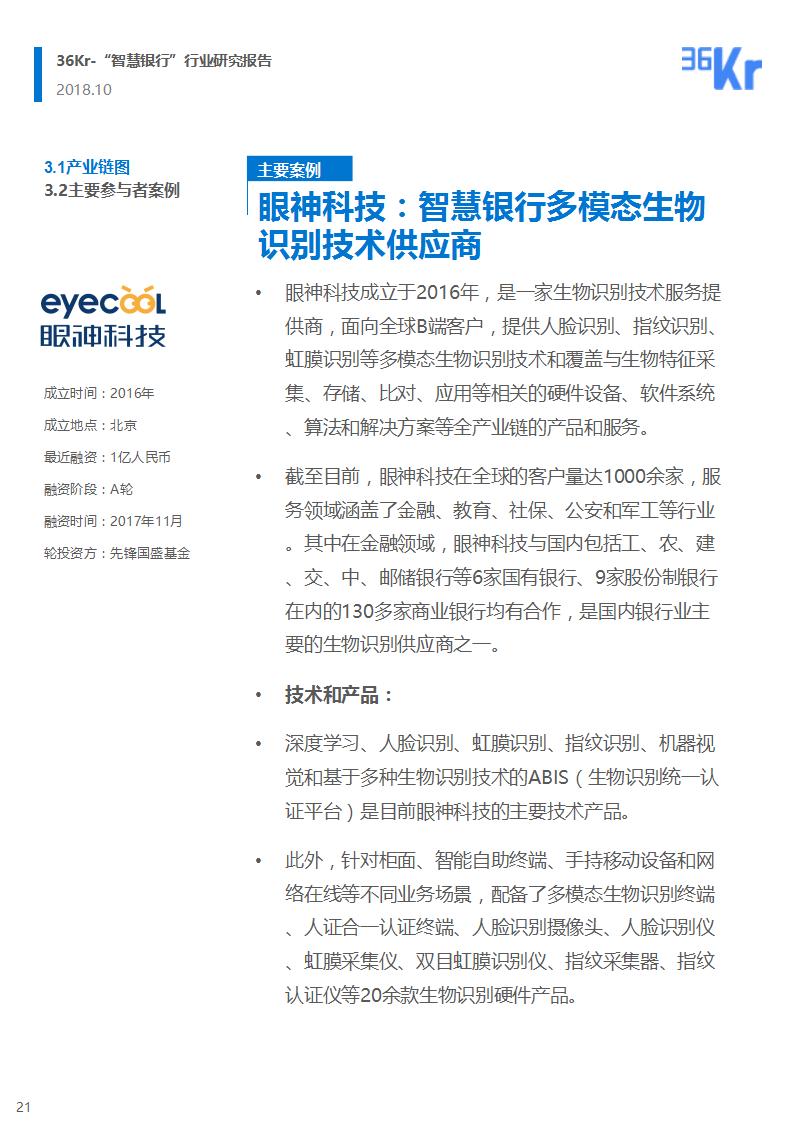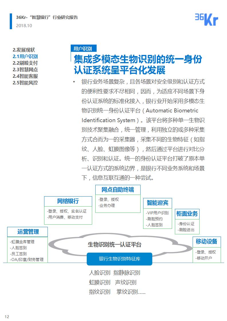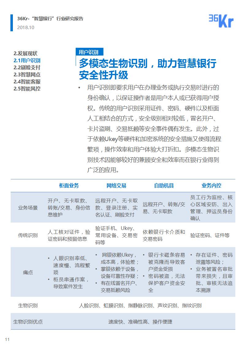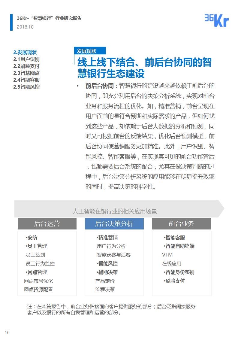 传统线下网点运营的成本压力使得银行一方面大量裁撤网点,另一方面也积极地投入智能化变革。当前,智慧银行呈现出线上线下结合、前后台协同的业态。其典型应用场景包括:用户识别、刷脸支付、智慧网点、智能客服和智能风控等。从产业链的角度来看,布局智慧银行领域的技术公司种类多样,其中,以生物识别、计算机视觉、自然语言处理、大数据等技术公司较为普遍,在应用上,生物识别和智能风控相对成熟。
