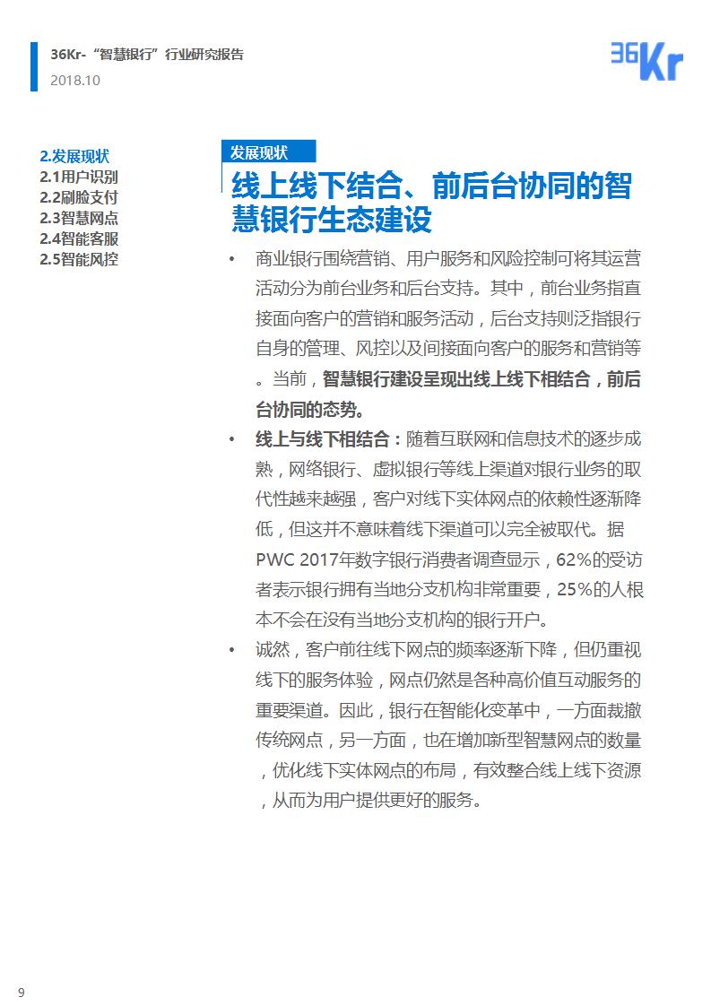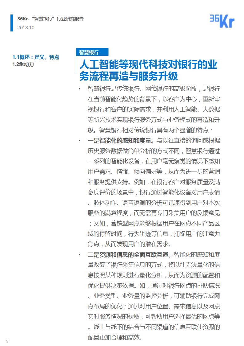 智慧银行是传统银行、网络银行的高级阶段,是银行在当前智能化趋势的背景下,以客户为中心,重新审视银行和客户的实际需求,并利用人工智能、大数据等新兴技术实现银行服务方式与业务模式的再造和升级。智慧银行相对传统银行具有两个显著的特点: