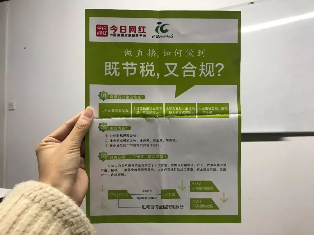 展区另一隅,汇诚咨询也吸引了我的视线,这是一家给直播公司节税的企业。