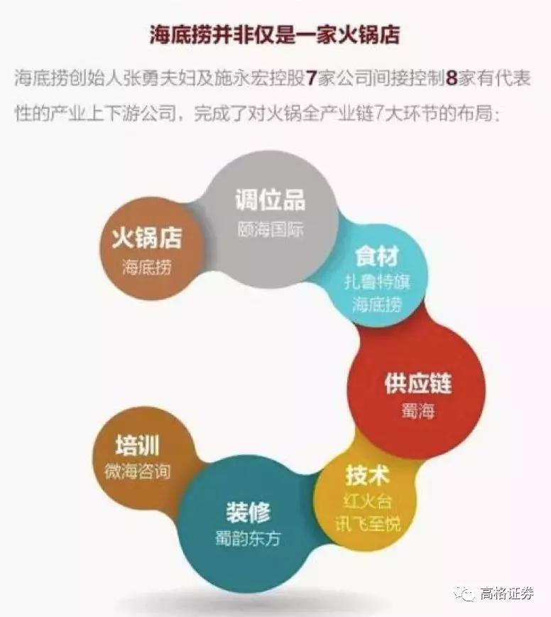 如今的海底捞已经不仅仅是一家餐厅,而是拥有完整供应链的餐饮集团——颐海国际供应火锅底料,且已经在港股上市;蜀海供应链负责菜品采购、中央厨房、仓储物流等托管服务;蜀韵东方负责餐厅设计施工;红火台负责软件管理系统;微海咨询和海晟通则负责招聘、培训、财务等方面咨询。