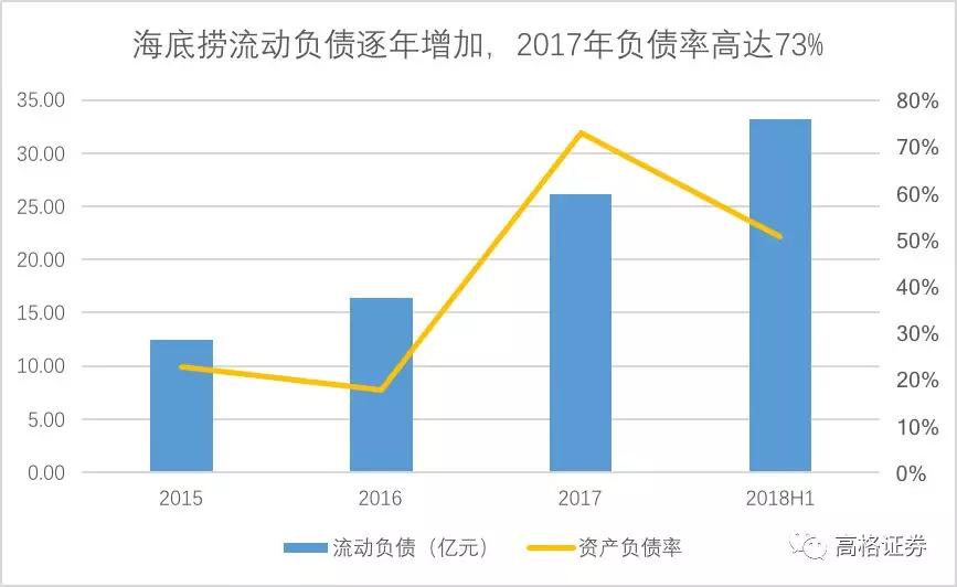 招股书显示,海底捞首次募集资金中15%拟用于还贷。另外,海底捞流动负债逐年增加,2017年资产负债率高达73%,2018年上半年虽有所下滑但仍超过50%,处于历史较高水平。