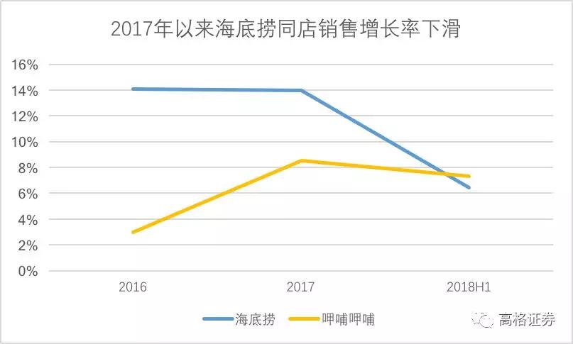 海底捞近两年不断扩大规模,营收高速增长的背后,是开业过渡期内新店翻台率不及老店,拖累整体盈利。2017年以来,海底捞同店销售增长率和净利润增速开始下滑。另外,员工和原料成本大幅上升,也给利润带来一定压力。