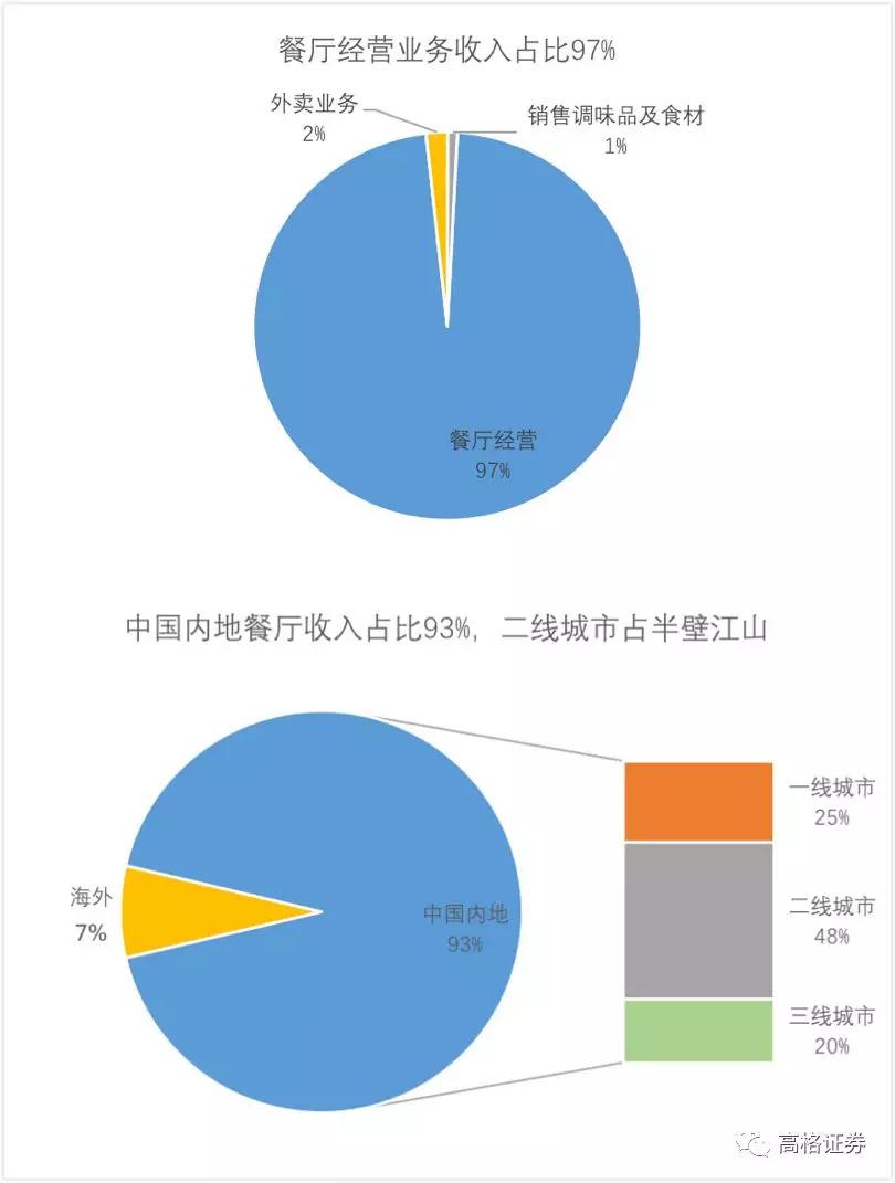 海底捞的主要收入是靠餐厅门店,上半年餐厅经营收入占比97%,外卖和销售调味品及食材收入仅占3%。按地区来看,中国内地餐厅收入占总收入的93%,其中二线城市占总收入比例将近一半。