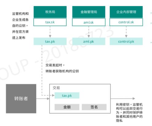 Duncan Wong 举例,A 给 B 发了一笔价值 10 个 ABE 代币的交易,怎么样做到让监管机构知道但是又不给大众知道呢?A 可以把这笔交易数值用监管机构公开的公钥加密,然后监管机构用私钥(公众没有私钥)进行解密,来查看交易数值,从而做到又有隐私又有监管。