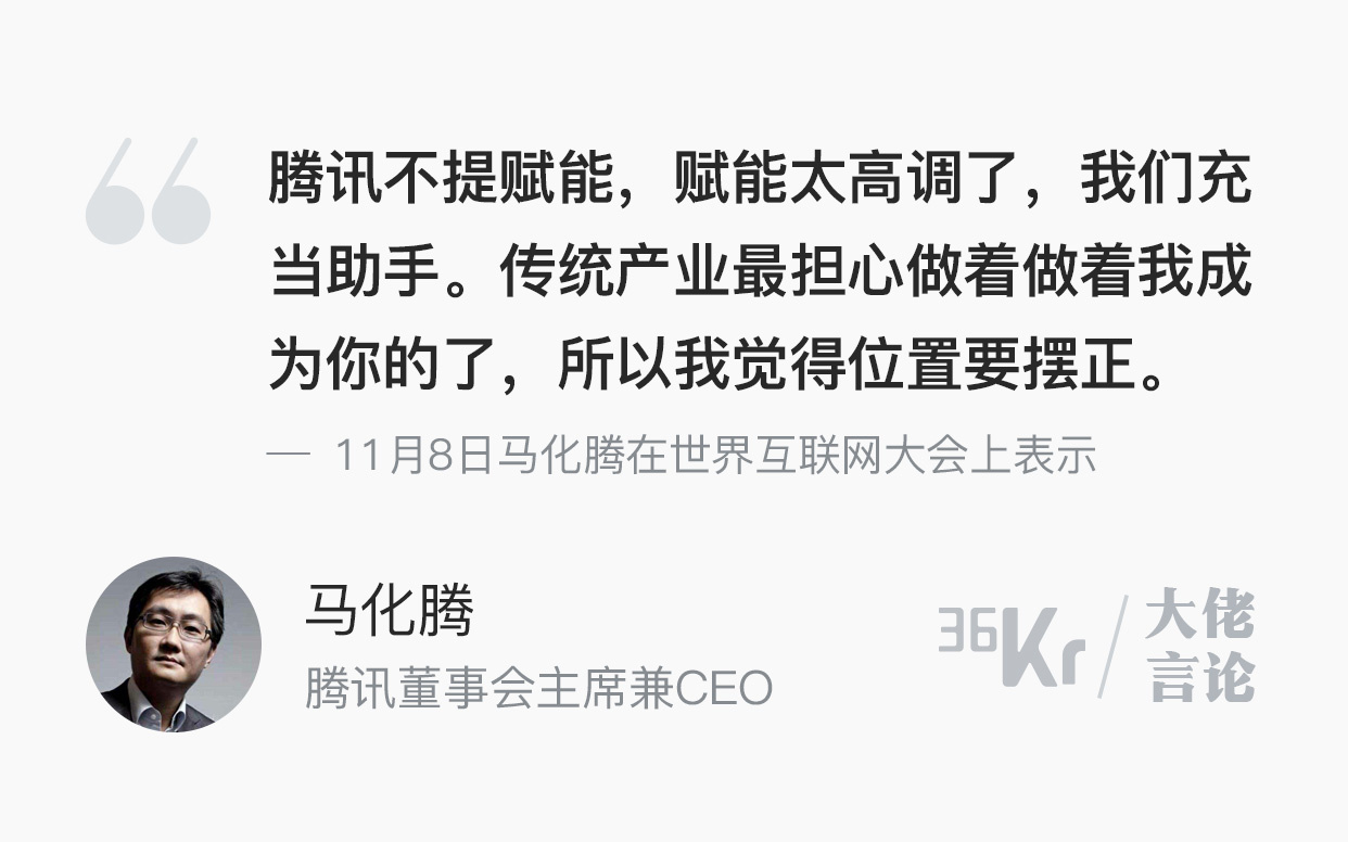 11月8日,马化腾在第五届世界互联网大会上上表示,“现在人口红利差不多了,需要在基数上提升,腾讯还是有优势的。我们不提赋能,赋能太高调了,我们是充当助手。传统产业最担心做着做着我成为你的了,所以我觉得位置要摆正。”