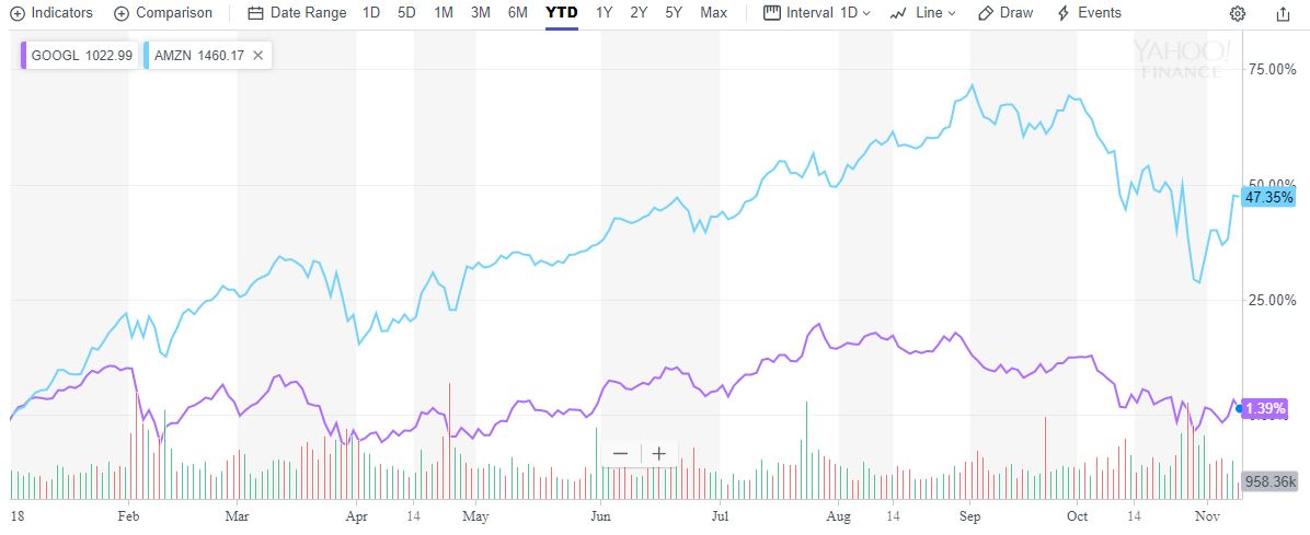 周四美股午盘,亚马逊接近平盘位,盘初最高涨1.7%,接近一个月新高。谷歌则低开低走,跌超1.6%,今年以来的表现大幅逊于亚马逊,不少谷歌员工正在抗议公司的防性骚扰政策失当。